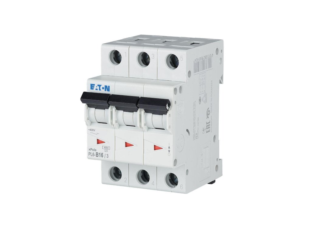 Třífázový jistič z ekonomické řady instalačních jističů EATON xPole PL6 do 63 A v třífázovém provedení, se zkratovou vypínací schopností 6 kA a charakteristikou B.